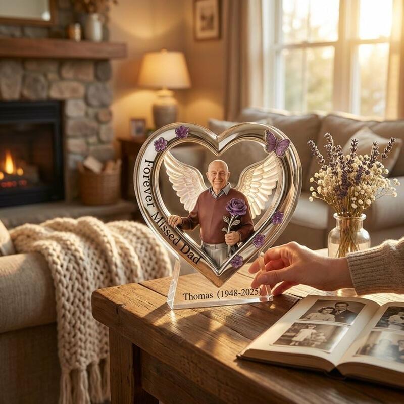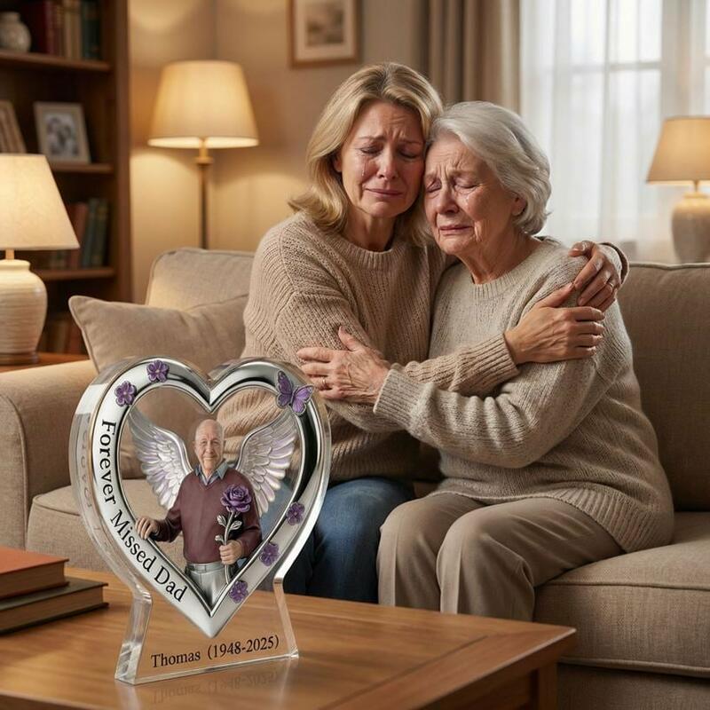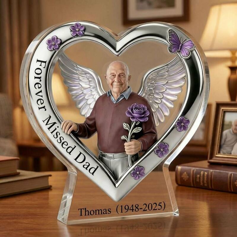 This Custom Acrylic Memorial Plaque is a tender, heartfelt tribute to honor the life and memory of your beloved father, grandfather, or cherished family member who has passed away. Crafted from premium, crystal-clear acrylic, this keepsake features an elegant heart-shaped frame adorned with delicate purple flowers and a butterfly, surrounding a portrait of your loved one framed by soft angel wings and a single purple rose—symbolizing eternal love, remembrance, and the gentle transition to eternal peace.