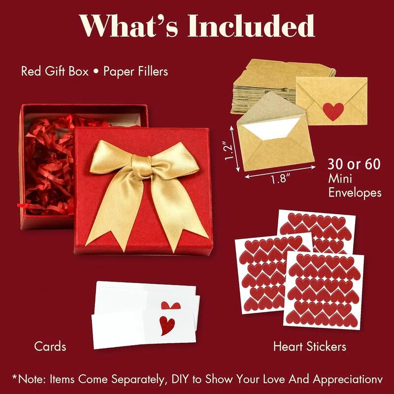 Each envelope features a charming red heart detail, adding a touch of romance and warmth to every creation. The red gift box, adorned with an elegant golden bow, enhances the sense of ceremony when you give gifts. Whether you choose 30 or 60 envelopes, you have enough to express all the emotions you want to convey—from the quietest admiration to the most exuberant love.