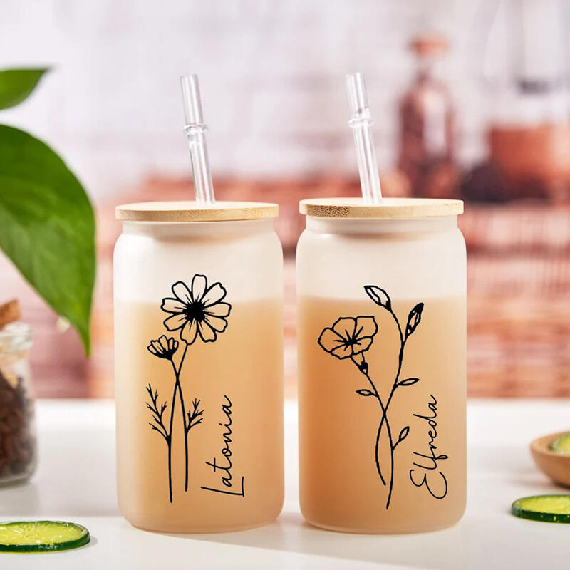 Personalized Birth Flower And Name Glass Cup with Lid And Straw Artistic Present for Boy Friend