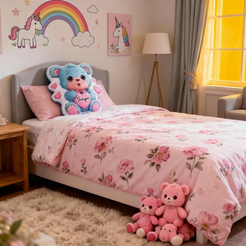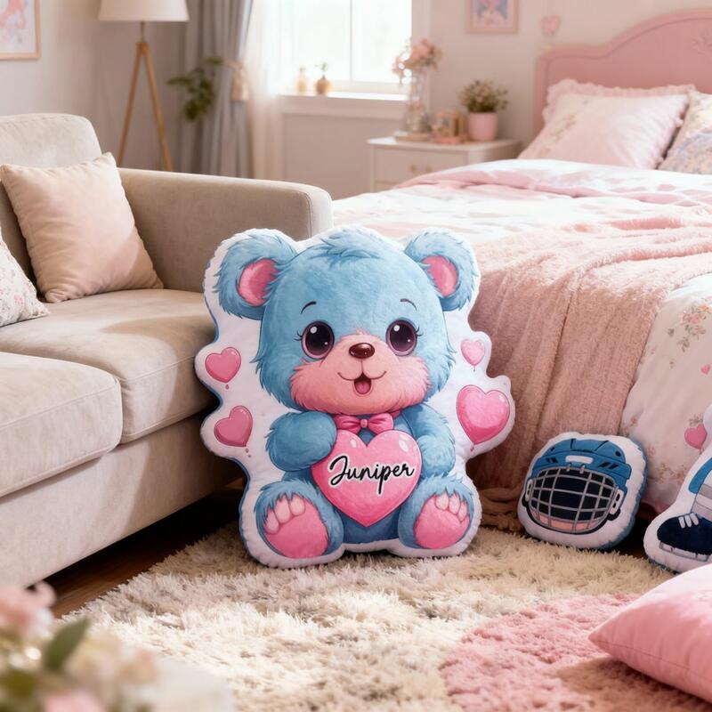 Personalized Blue Heart-Shaped Bear Pillow Custom Child's Name Birthday Gift for Kids