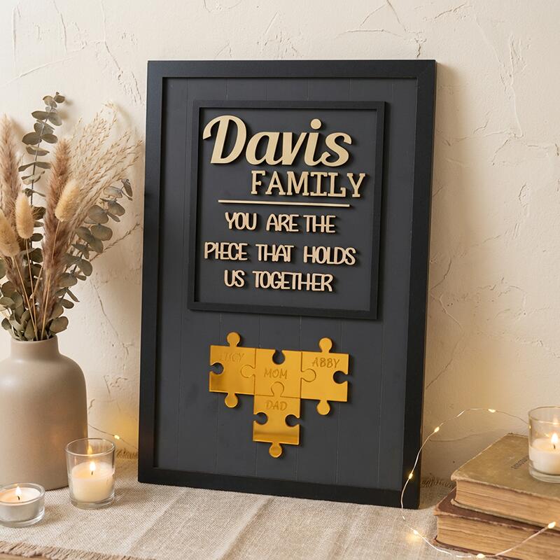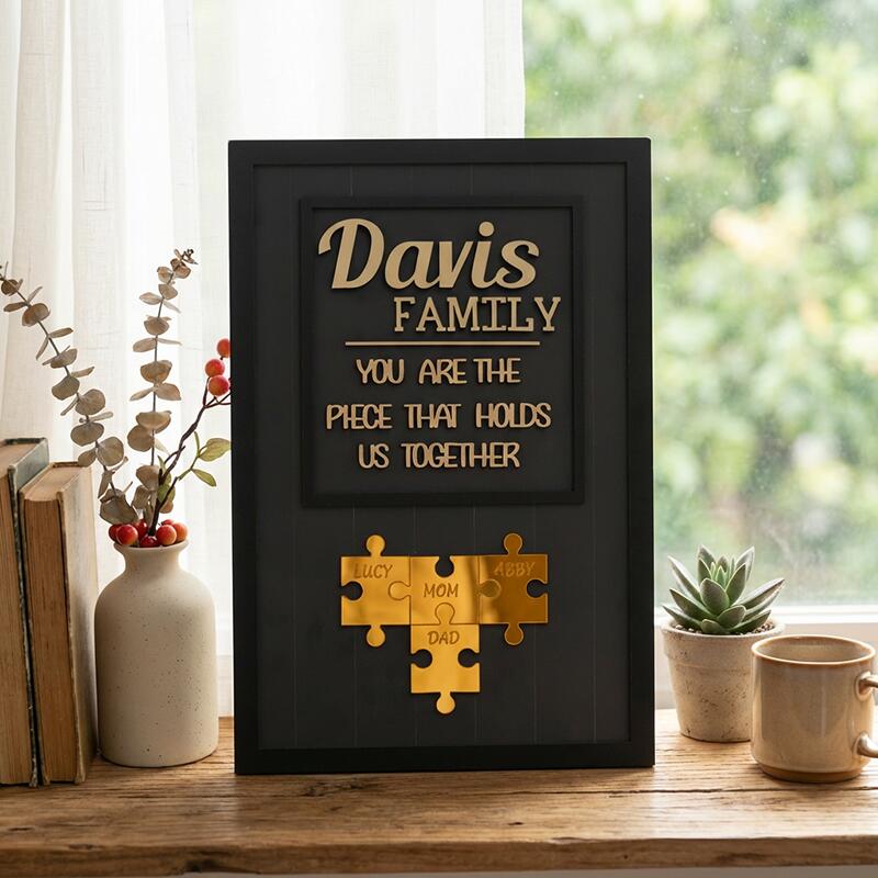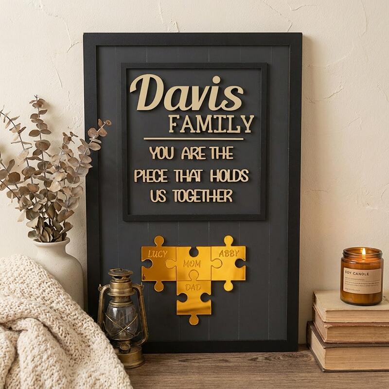 Designed with a warm, minimalist aesthetic, this custom piece features your family name proudly displayed at the top, paired with the heartfelt message “You are the piece that holds us together” to celebrate the love that binds your household. At the center, a set of interlocking puzzle pieces is engraved with the names of every family member—mom, dad, kids, or any loved ones you choose—visually telling the story of how your family fits perfectly as one. The natural wood finish and sleek frame make it a versatile, elegant addition to any home, turning a shelf, mantel, or wall into a daily celebration of your family’s love.