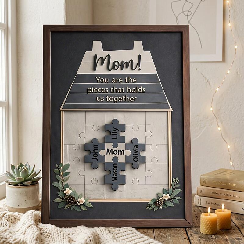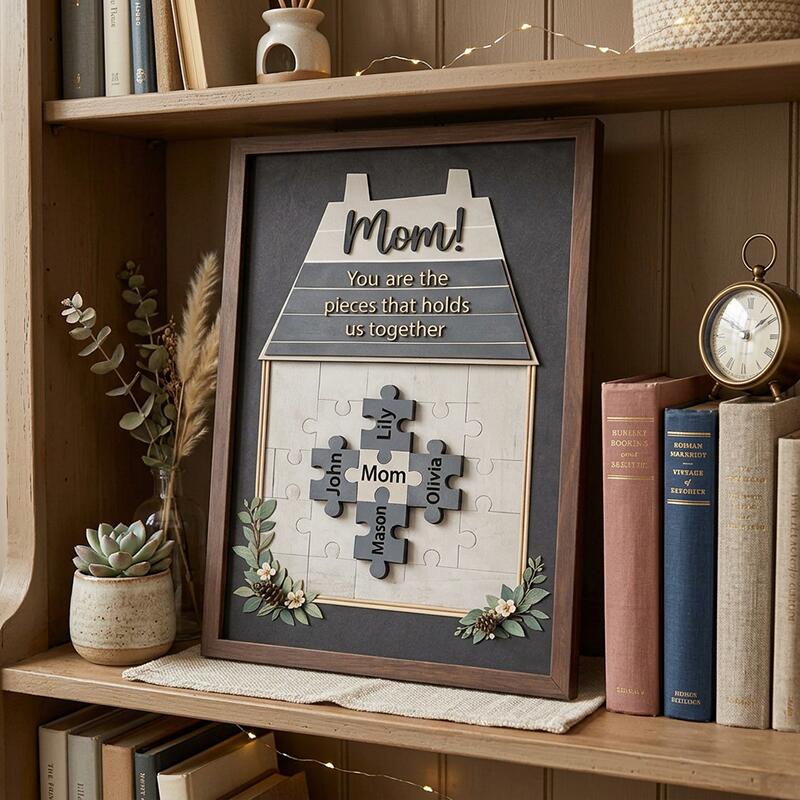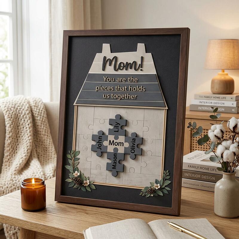 Designed with a warm, cozy house motif, this custom piece features a heartfelt message atop the roof: “Mom! You are the piece that holds us together,” a permanent reminder of her irreplaceable role as the glue of your family. At the center, a set of interlocking puzzle pieces is engraved with the names of her children, partner, or any loved ones you choose, visually telling the story of how mom is the heart that makes your family whole. Delicate wooden floral and greenery accents frame the bottom of the design, adding a natural, charming touch that elevates the warm, rustic aesthetic. The natural wood frame and soft neutral background make it a versatile, timeless addition to any home decor, turning a blank wall or shelf into a daily celebration of her love and devotion.