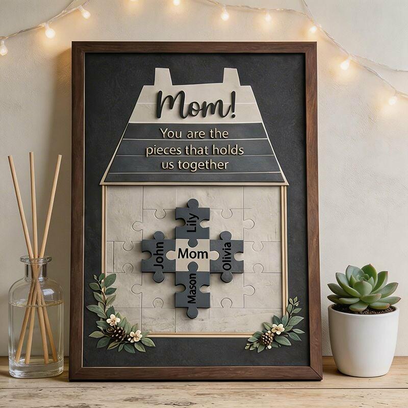 This personalized mom house puzzle name framed art is a heartfelt, timeless tribute to the mom who holds your entire family together, crafted with custom names to honor your unique bond.