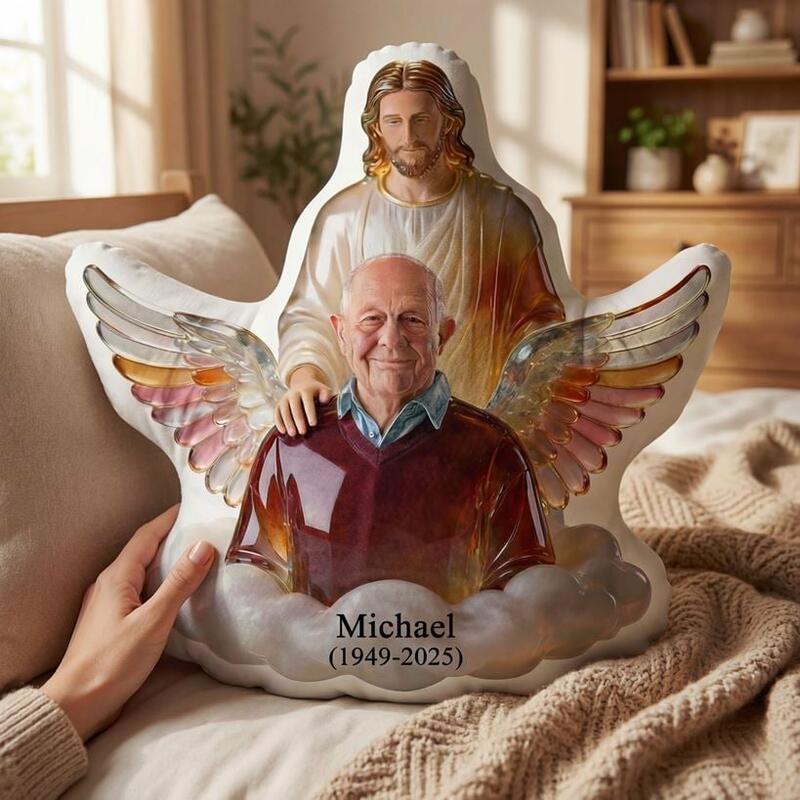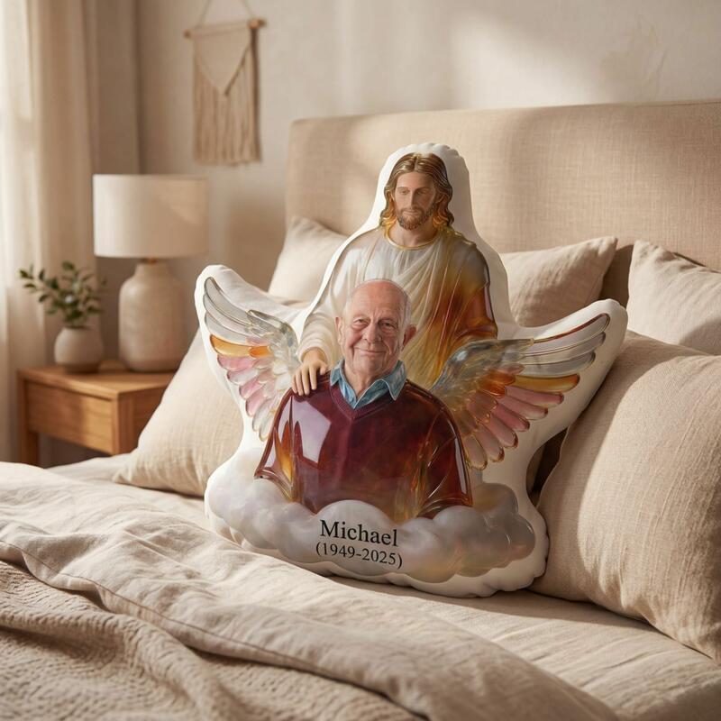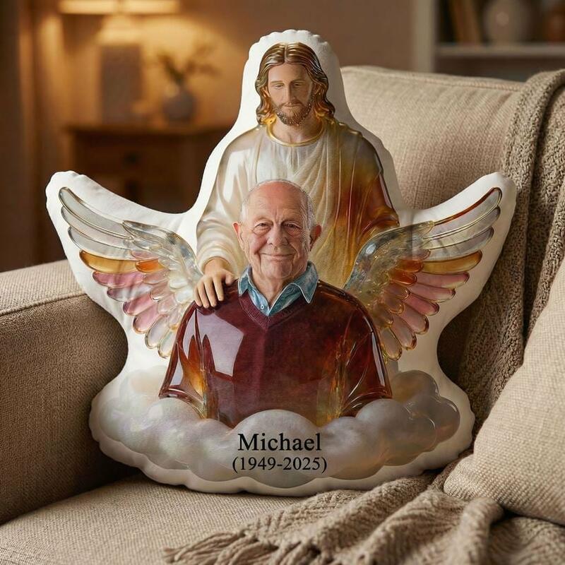 This Custom Shaped Memorial Pillow is a tender, faith-inspired tribute to honor your beloved father, grandfather, or cherished male family member who has passed away. Crafted from soft fabric, it features a serene design: Jesus stands protectively behind your loved one, framed by iridescent angel wings and soft clouds—symbols of divine care, eternal peace, and the hope of everlasting life in Christian faith.