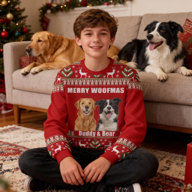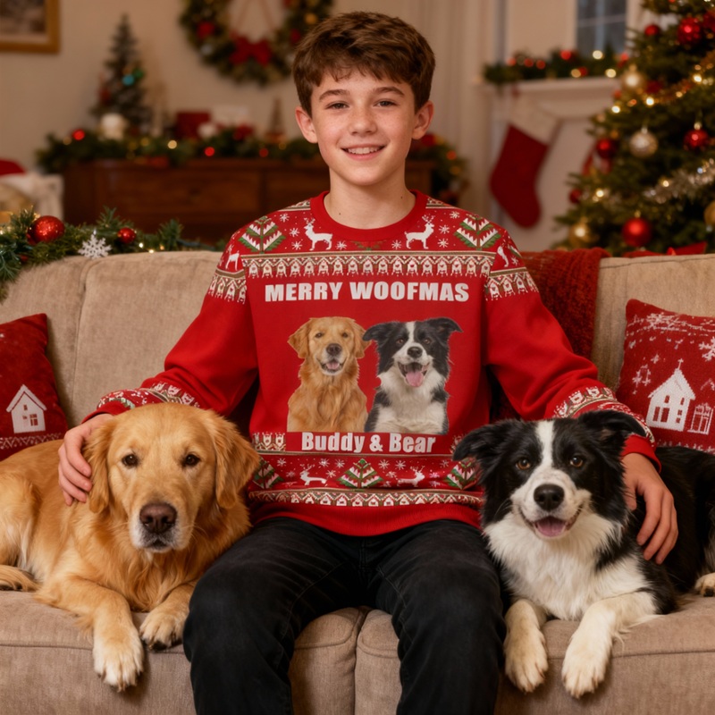 Give gifts this Christmas that are both personal and fun. Imagine the laughter your children will have when they see their pet's expression or a funny family photo. Choose one of our custom ugly Christmas sweaters to create unique, happy, and unforgettable memories, making every wear a special holiday moment!
