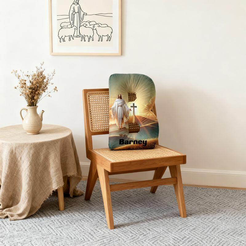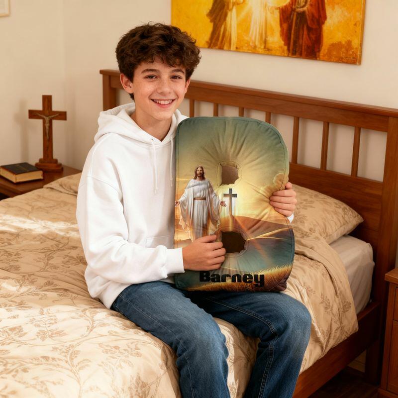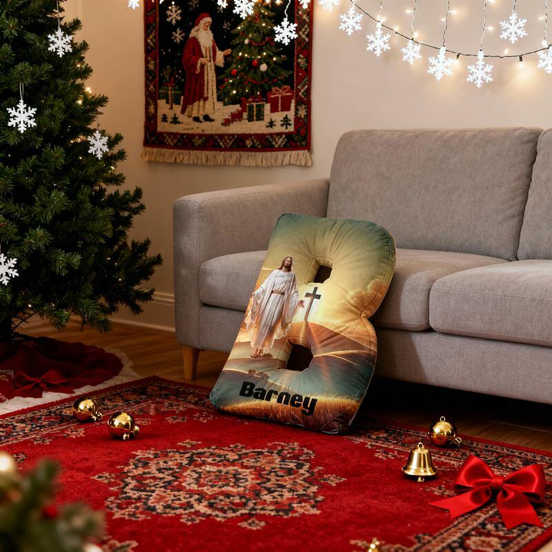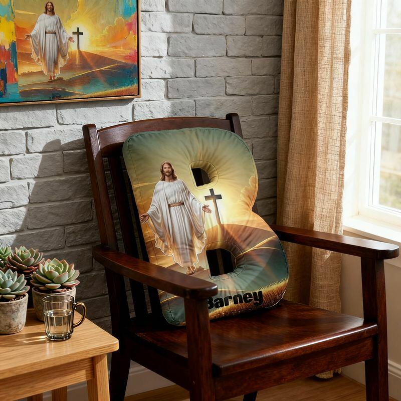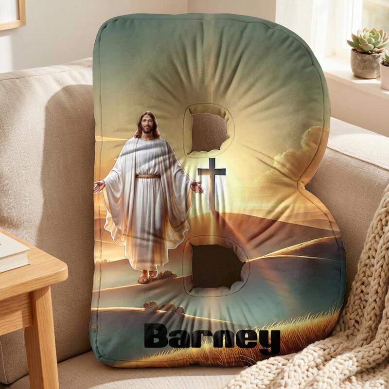 Personalized Letter-Shaped Pillow Jesus Cross Sunrise Light Design Religious Faith Gift