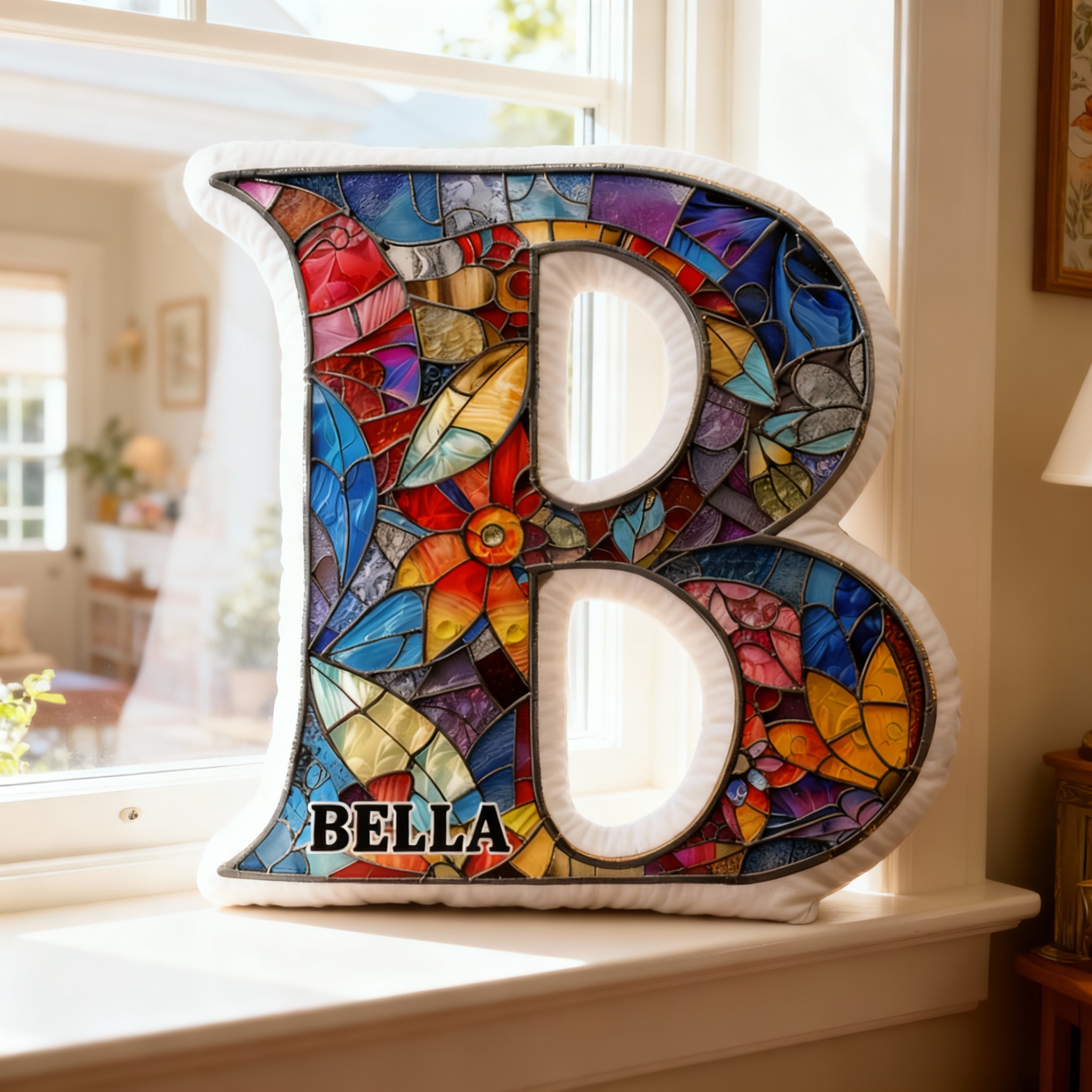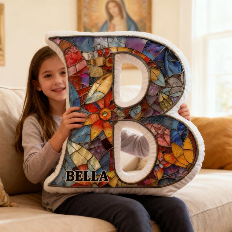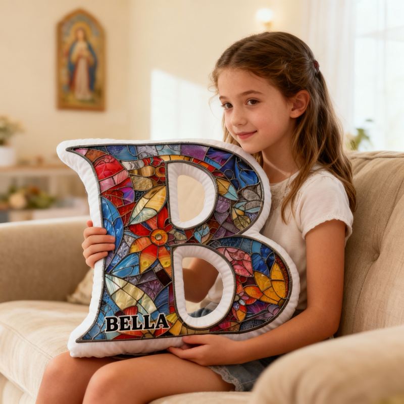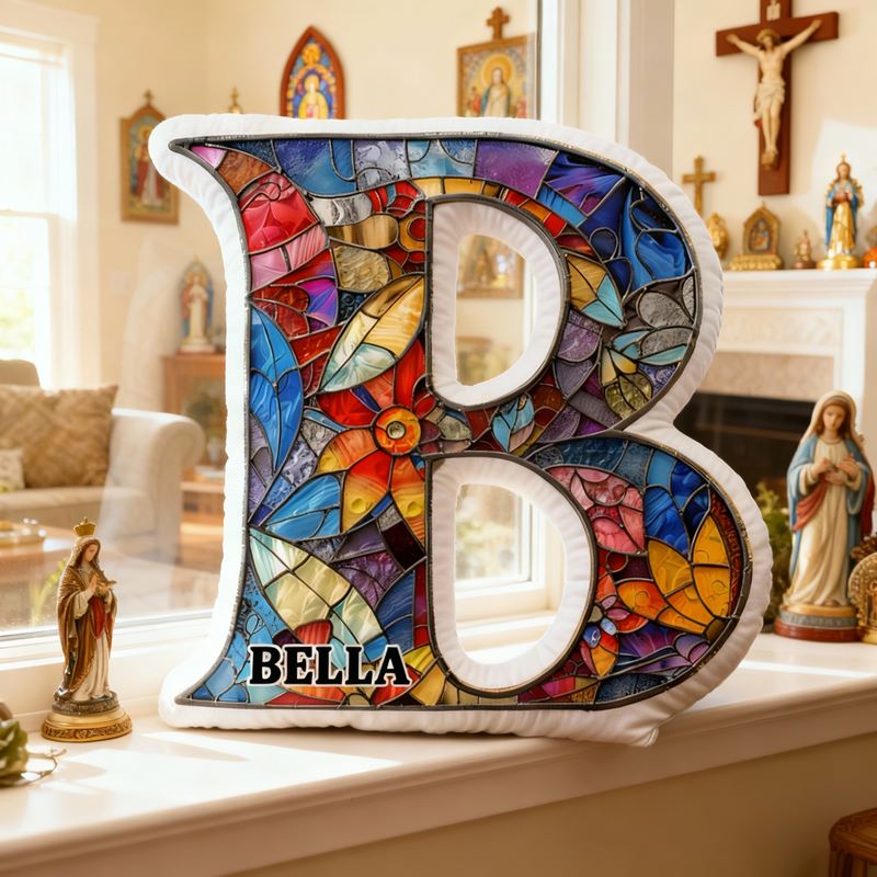 Personalized Letter-Shaped Pillow Stained Glass Alphabet Design Religious Home Decor Gift