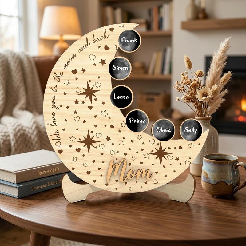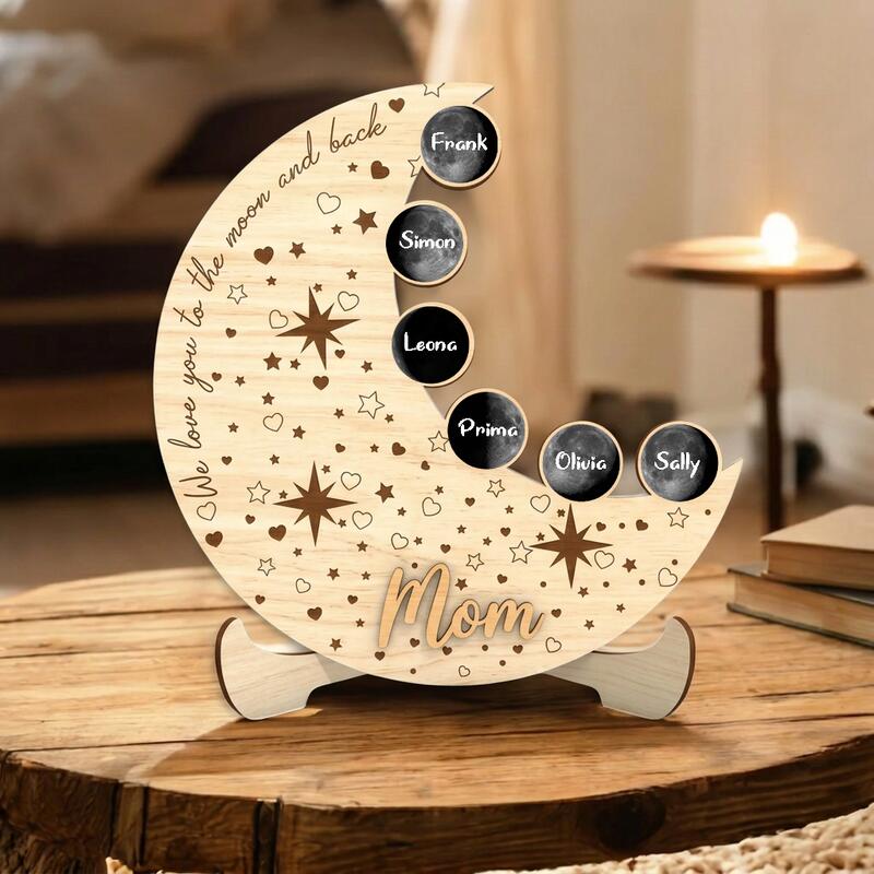 Fully customizable to your unique family story, you can add the names of children, grandchildren, partners, or any beloved family members to each individual moon phase cutout, turning a simple design into a deeply personal reflection of the family she holds dear. The frame's moon shape is adorned with delicate hand-drawn stars and hearts, paired with the timeless, loving phrase “We love you to the moon and back,” and finished with a warm, raised “Mom” lettering at the base, making every detail a celebration of her role as the heart of your family.