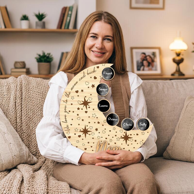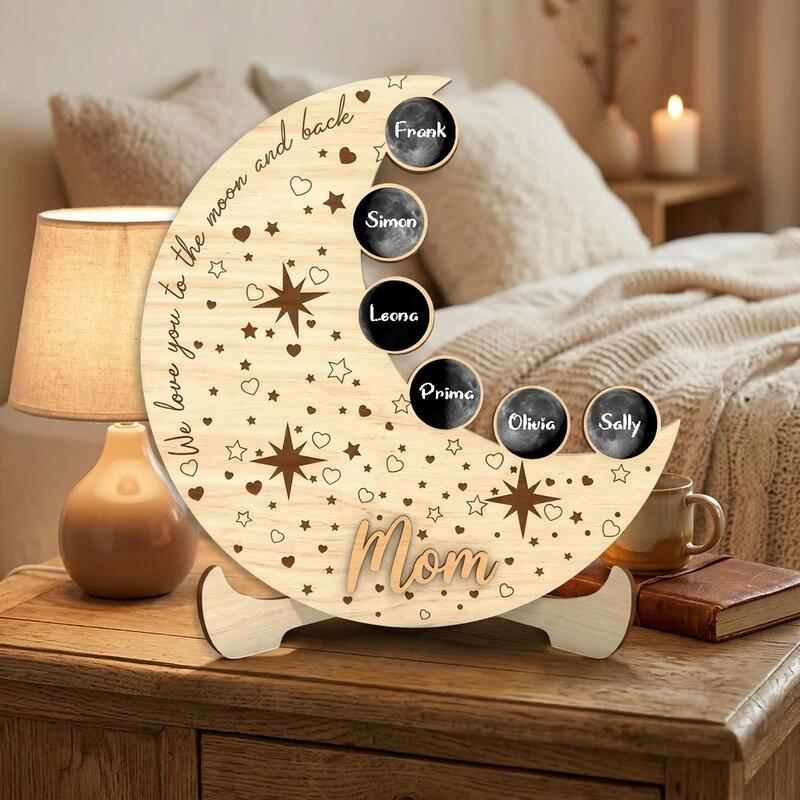 This one-of-a-kind personalized moon phase keepsake is a heartfelt, handcrafted tribute crafted to honor the boundless love of a mom, celebrating the way her light guides and connects every member of her family. More than just a decorative piece, it turns the magic of the night sky into a meaningful keepsake, where each moon phase circle is customized with the names of her loved ones, creating a celestial family constellation just for her.