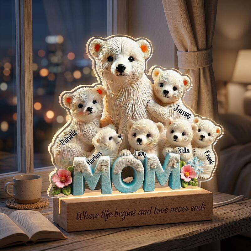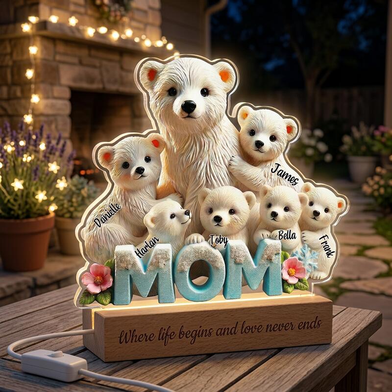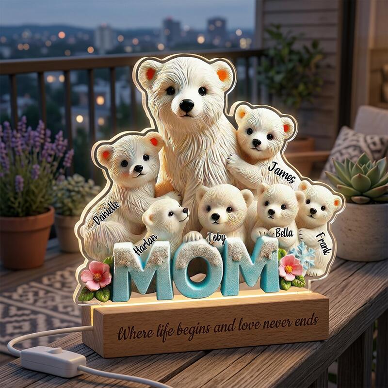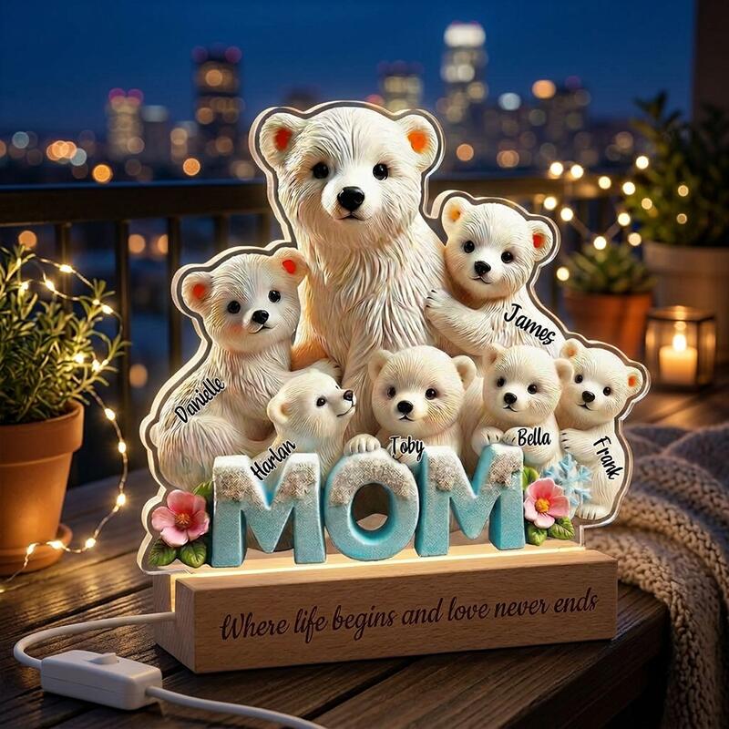 Designed with a sweet, cozy scene of a mama polar bear surrounded by her playful cubs, this custom night light lets you engrave each baby bear with the name of your child, grandchild, or any loved one, turning a simple decor piece into a timeless celebration of your unique family bond. The warm, soft glow from the base casts a gentle, comforting light in any room, while the heartfelt phrase “Where life begins and love never ends” etched on the wooden stand adds a touching, permanent reminder of the endless love only a mom can give.