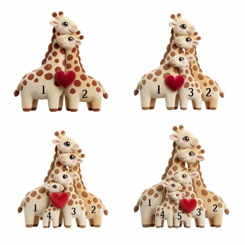 The design tells a story: giraffes arranged together in a vertical embrace—“Dad” and “Mom” standing protectively on either side, with the kid nestled in the center. A glowing red heart adds warmth and affection. Giraffes, with their gentle nature and graceful presence, embody care, perspective, and protection. Their arrangement reflects the strength of parents surrounding their child, a reminder of love that shelters and uplifts.