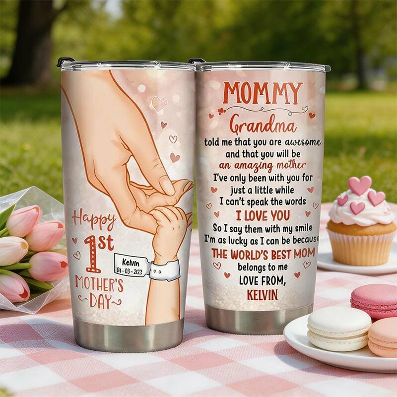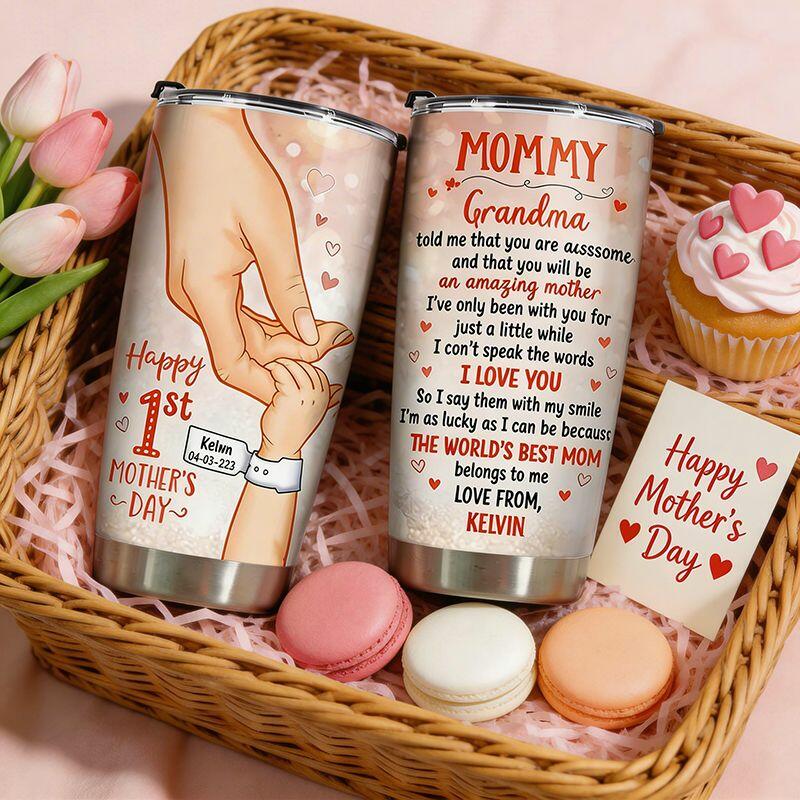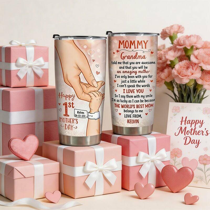 Personalized Name Tumbler with Hand-holding Pattern Heartwarming Present for Mommy