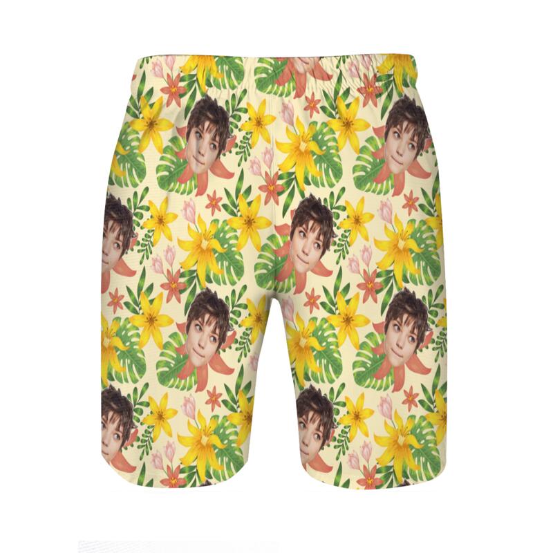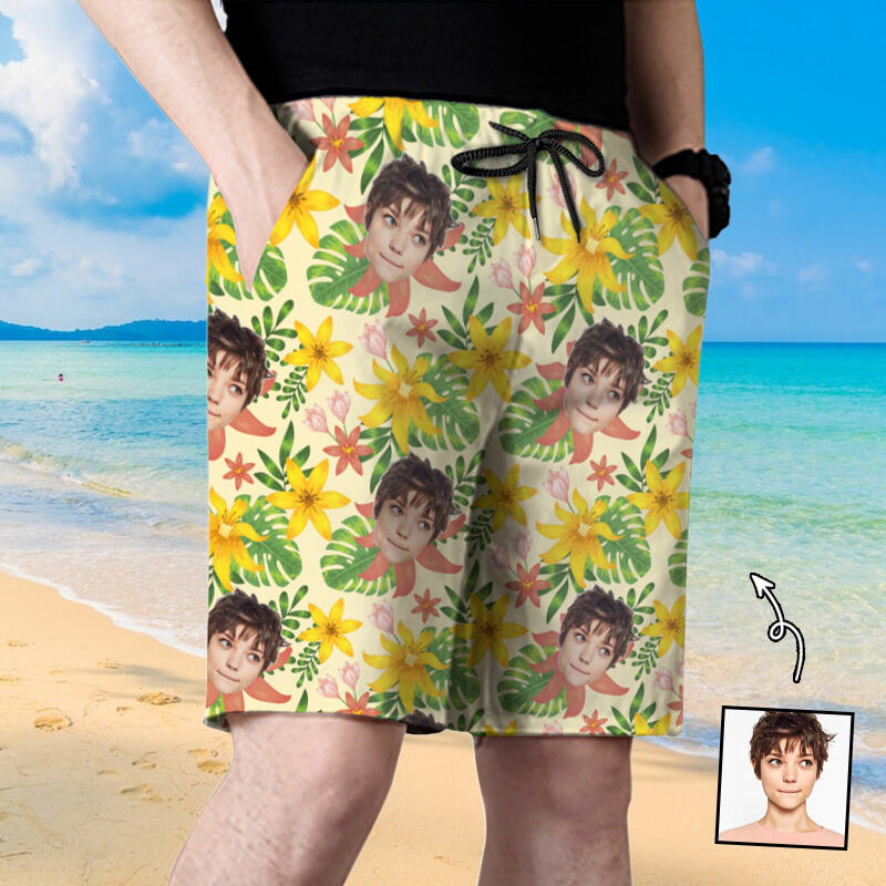 Personalized Picture Men's Beach Shorts Yellow Floral Pattern Creative Gift for Friend