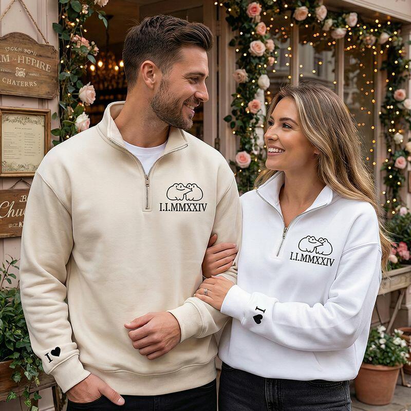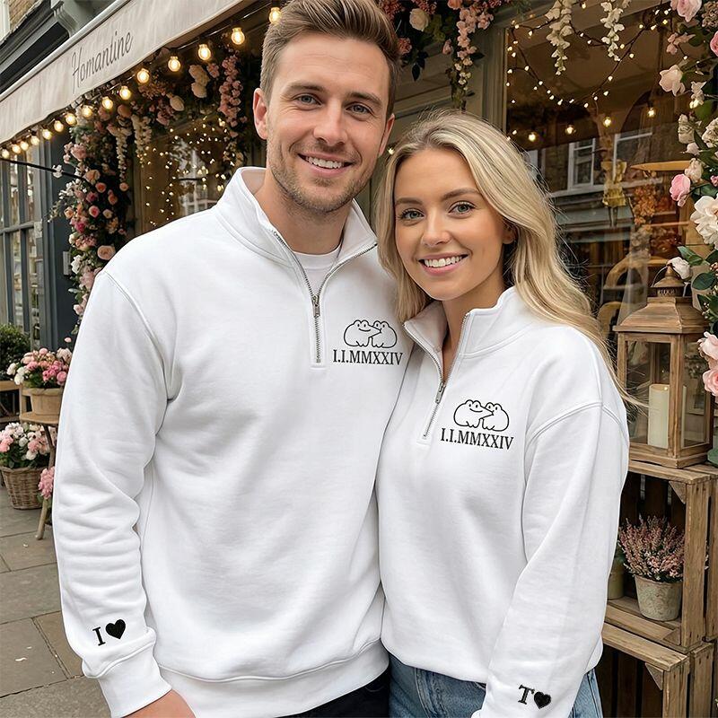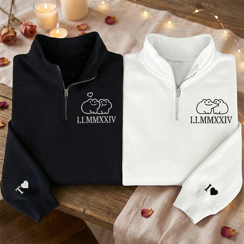 Personalized Quarter Zip Sweatshirt Embroidered Custom Frog Couple with Roman Numeral Date Cute Anniversary Gift