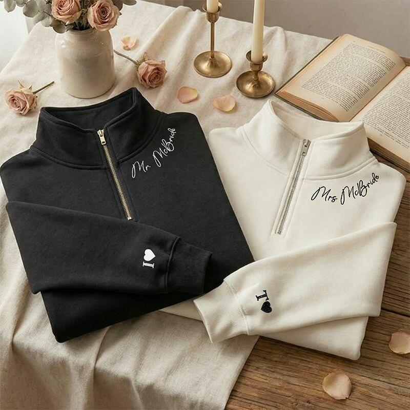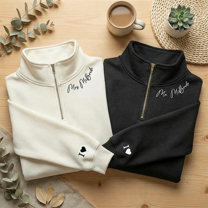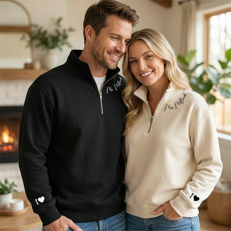 Personalized Quarter Zip Sweatshirt Embroidered Custom Name On The Neckline Design Perfect Gift for Couples