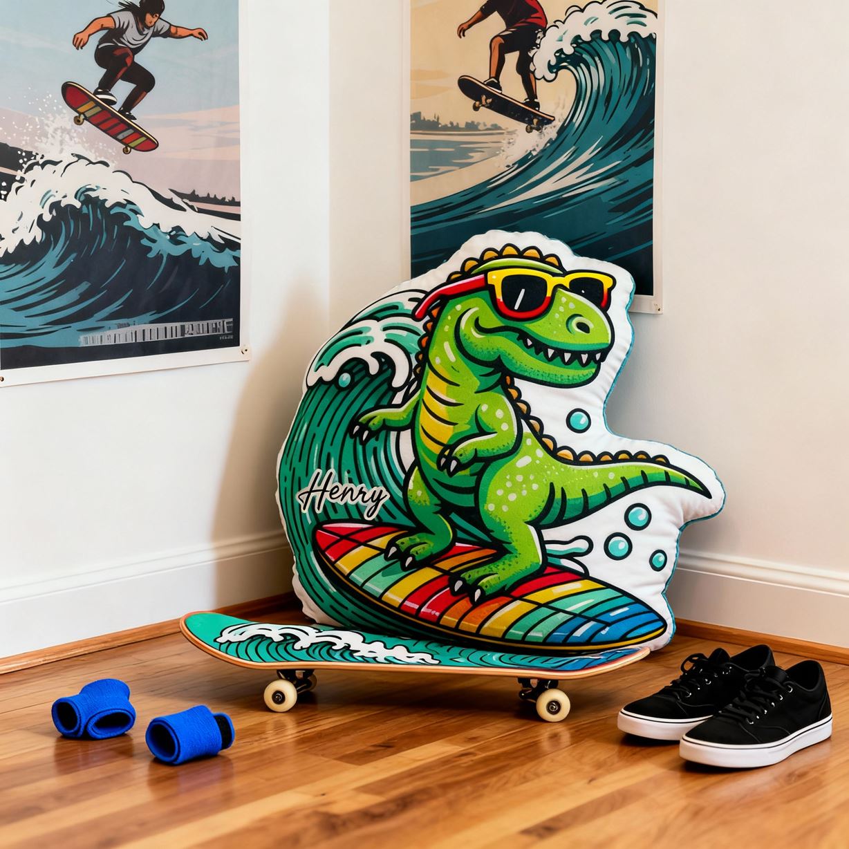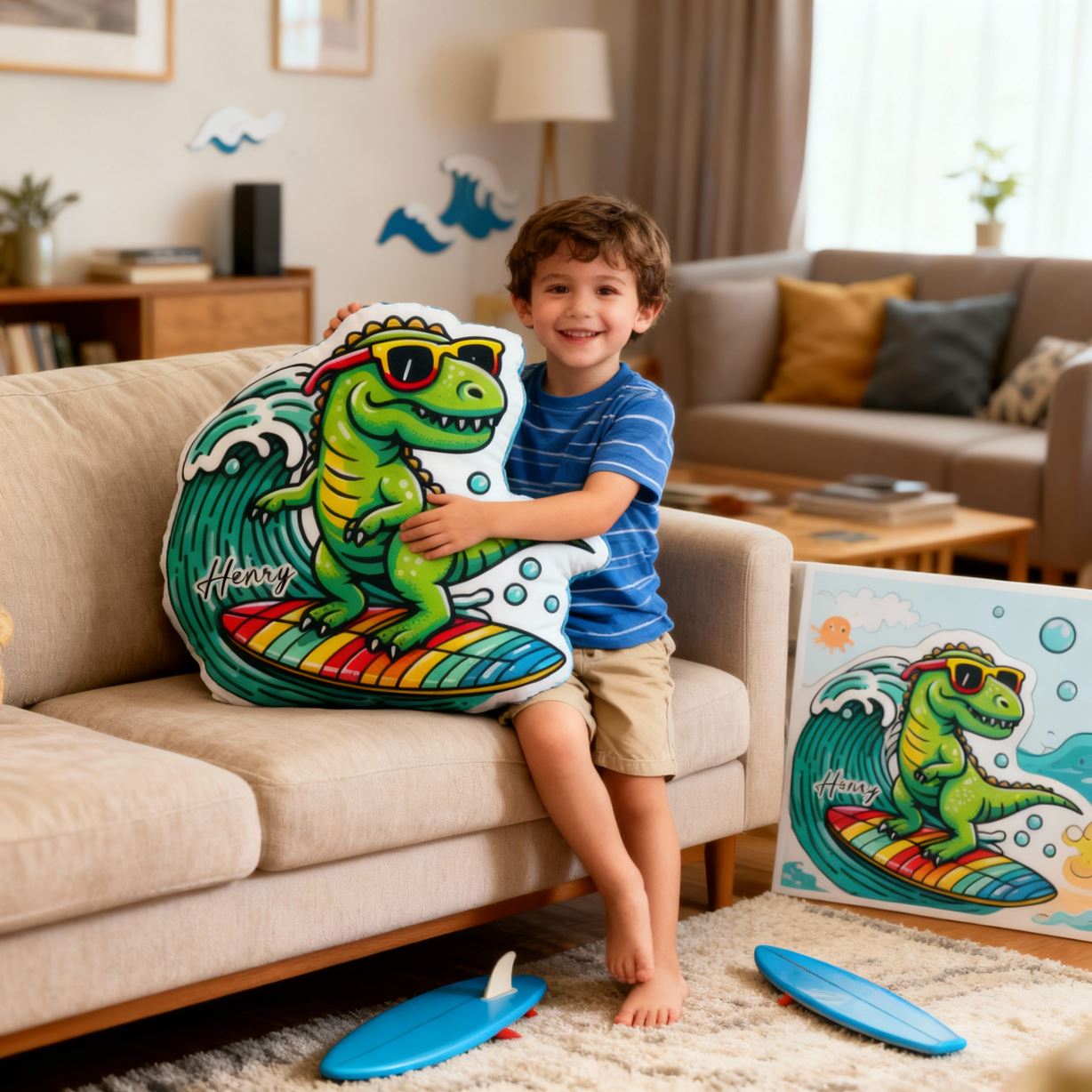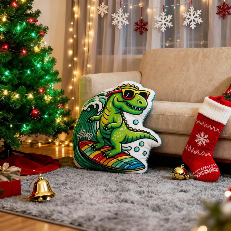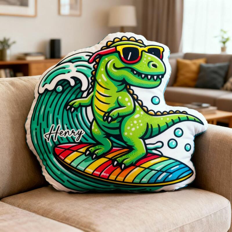 Personalized Surfing Dinosaur Pillow Cartoon Dinosaur Pillow Fun Print a Great Gift for Boys