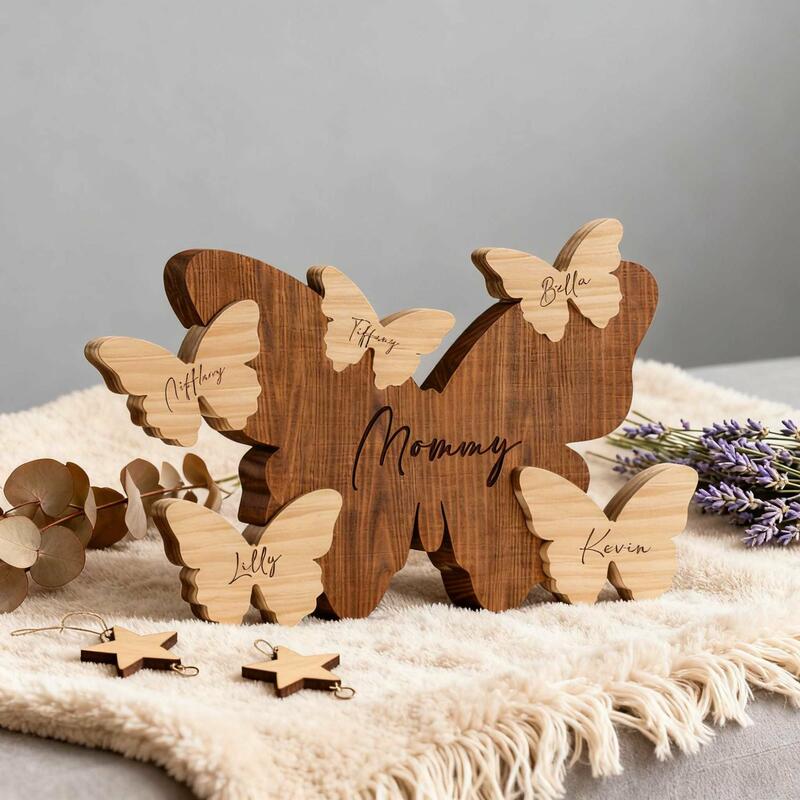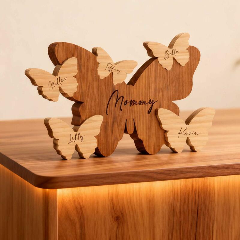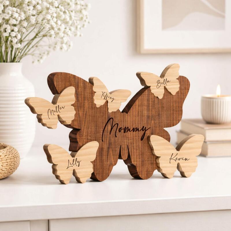 Nothing can compare to the serene and warm familial affection within a family. This personalized butterfly family wooden puzzle perfectly captures this bond of love. Each gentle curve and shared sentiment in it embodies this emotion. It is not just a piece of decoration, but a tangible symbol of home. It carries love, laughter, and reunion, making the house a true home. From loving parents to lively little ones, each butterfly shape is accompanied by a name, telling your unique story, transforming ordinary wood into an extraordinary symbol, representing your eternal family.